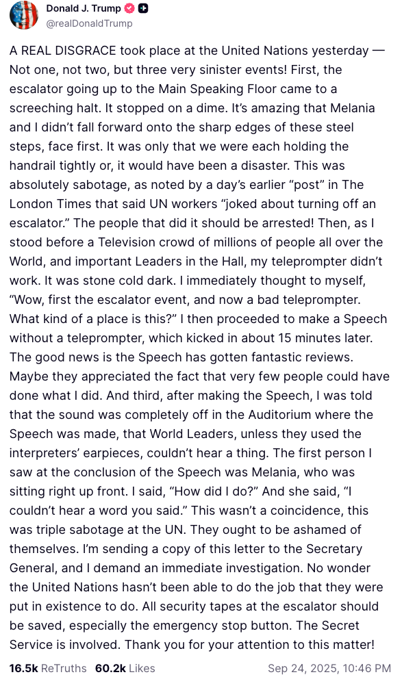 Only The Don could turn a minor mechanical hiccup into a full-blown conspiracy. As Donny made his grand entrance at the UN General Assembly, the escalator froze mid-glide, forcing America’s self-styled Sun King to endure the indignity of… walking up the steps. A tragedy for the ages.