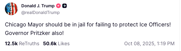 This time, Dozy Don has openly called for the imprisonment of Chicago Mayor Brandon Johnson and Illinois Governor J.B. Pritzker, two of his most vocal critics. Their crime? Daring to oppose his unconstitutional deployment of federal troops and his ongoing mass deportation campaign that’s already turned Illinois into a political battleground.