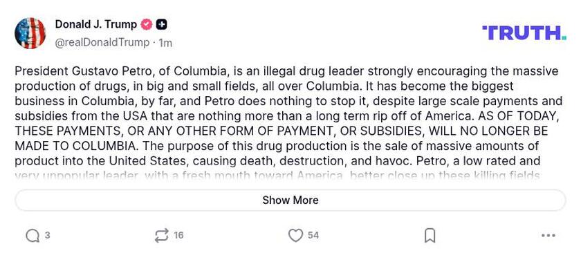 “Gustavo Petro — very low rated, very unpopular, terrible leader. An illegal drug dealer, very corrupt. Needs to close up these killing fields immediately, or we’ll close them up for him, and it won’t be done nicely!”