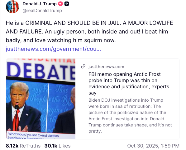 No one’s entirely sure who Donny was frothing about this time — Jack Smith? Joe Biden? Merrick Garland? — because the post linked to a conspiratorial piece from Just the News, a MAGA content mill best known for laundering grievances into “articles.”