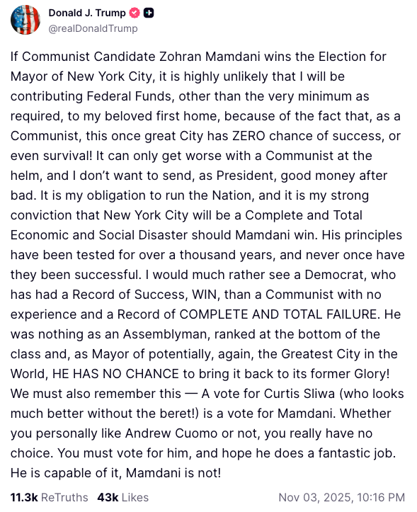 “If Mamdani wins, New York will get minimal federal funding,” he raged, as if public infrastructure, education, and food programs were his personal playthings.